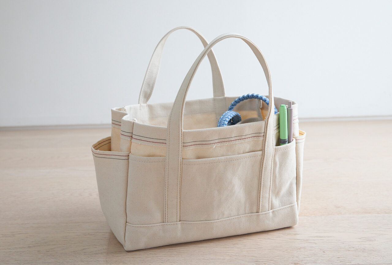 多くの方に愛されていたセルヴィッジトートをモチーフにデザインし、たっぷり収納できる幅広のマチと、使いやすい外ポケットを設けました。普段のお出かけにぴったりのトートバッグです。
